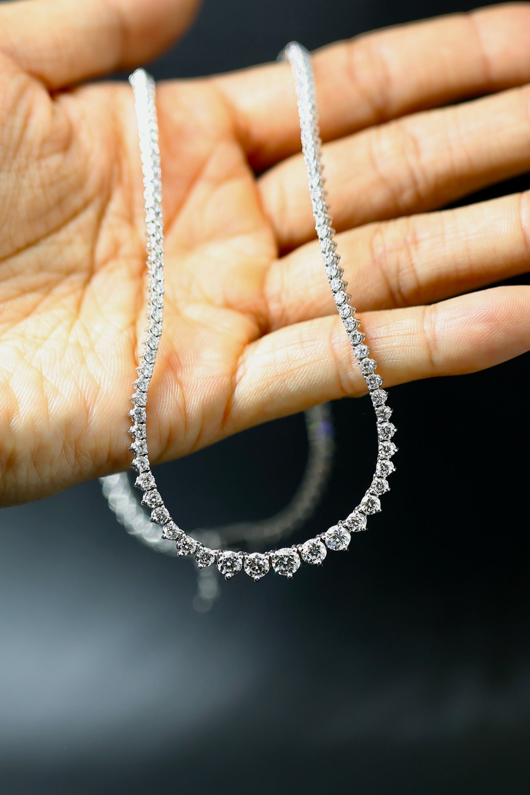 This 7.5-carat lab-grown diamond Riviera necklace is a true showstopper, featuring graduating round brilliant diamonds (D color, VS1 - VVS2 clarity) set in 14K white gold. The elegant 18-inch length gracefully sits along the collarbone, making it a perfect statement piece for special occasions or everyday luxury.