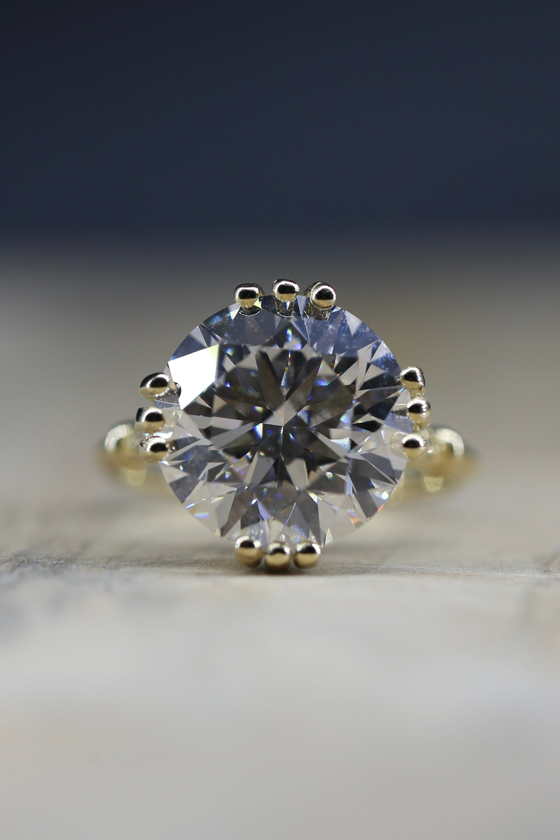 Timeless romance meets modern craftsmanship in this stunning Edwardian-inspired ring, featuring a breathtaking 7.00 carat round brilliant lab-grown diamond. Set in warm 14K yellow gold, this vintage-style piece blends antique elegance with ethical luxury.
