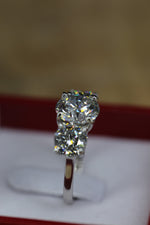 This timeless 6.50 carat lab-grown diamond three-stone ring is crafted in solid 14K white gold and hand-made in Los Angeles.