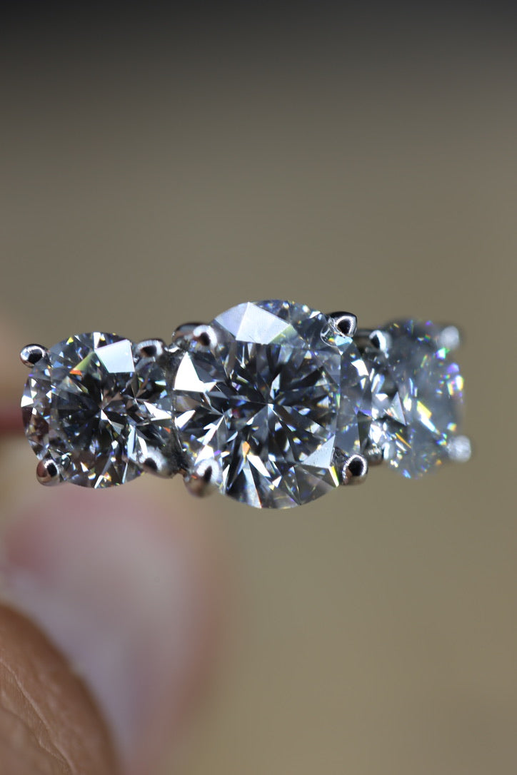 Elegant, powerful, and symbolic, the three-stone design represents past, present, and future — a classic style loved by royalty and modern icons alike.