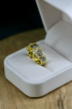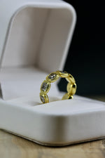 This Antique Cushion Eternity Band pays homage to the timeless beauty of vintage jewelry. Featuring D color, VVS1 clarity lab-grown cushion diamonds, the ring glows with refined brilliance across an antique curved setting. The warmth of 18K yellow gold paired with the precision of hand craftsmanship in Los Angeles creates a piece that’s both heirloom-worthy and sustainably made.