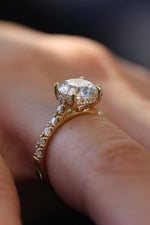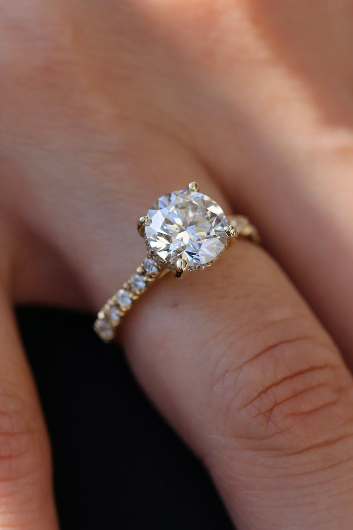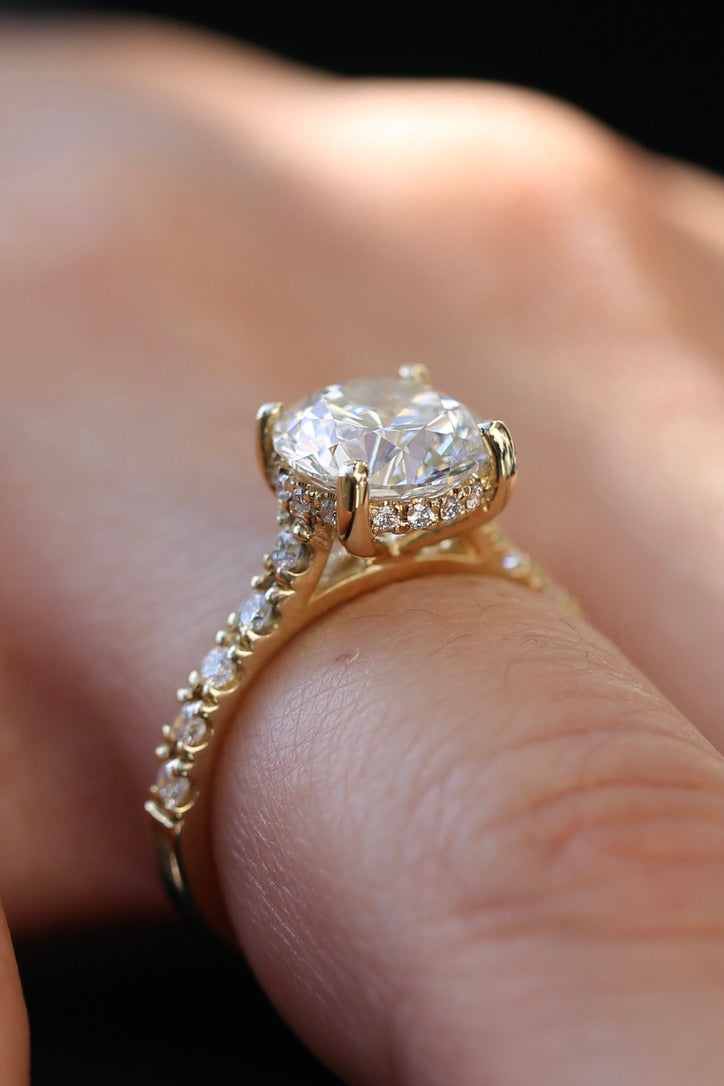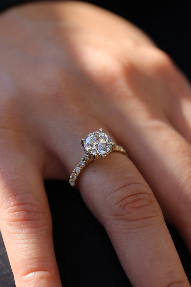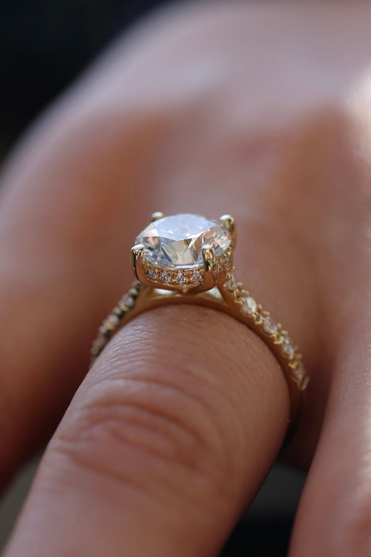 This ring embodies modern luxury with classic romance. The 2.5 carat center diamond, cut to perfection, radiates fire and brilliance. Beneath the crown, a hidden halo of D/VVS1 round brilliants adds a secret sparkle that glows from every angle. Crafted in 14K yellow gold, this design combines warmth, balance, and timeless sophistication — all handmade in Los Angeles.