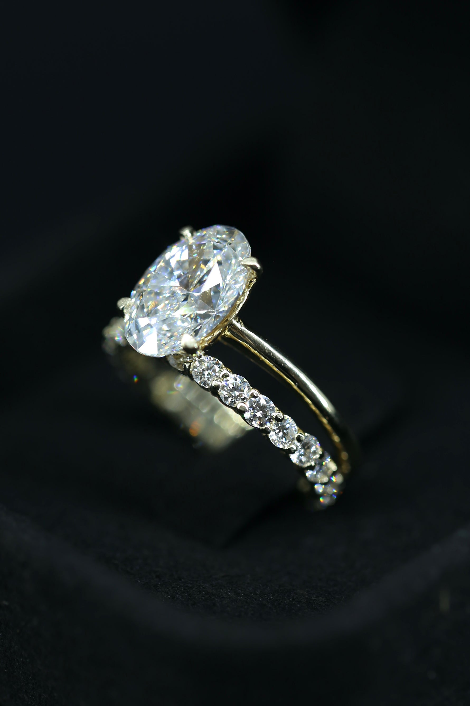 3 carat oval lab grown diamond ring GIA certified yellow gold with wedding band